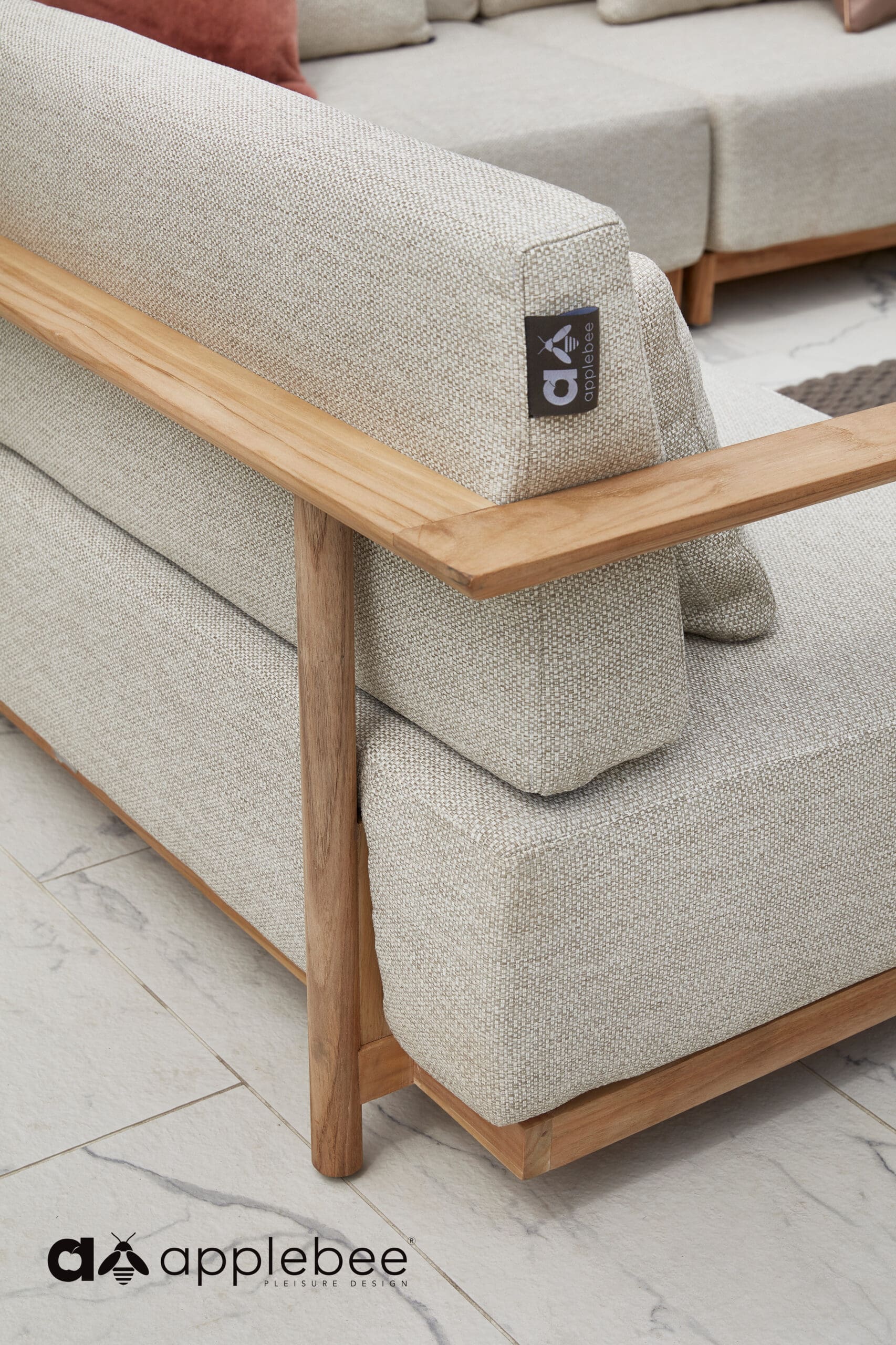 Elegant hjørnegruppe med ramme av teak og Applebees BeeWett puter som tåler både regn og vann, tørker raskt og har god sittekomfort. Putene til St. Lucia er hele 25cm tykke. Med sine runde bein som går elegant over til den smakfulle ryggstøtten som strekker seg fra armen og over ryggen, blir dette en elegant hjørnegruppe.